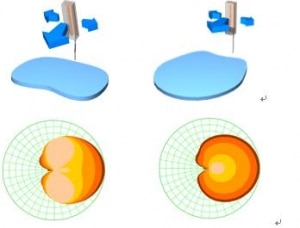 因此,隨著站點高度H的增加以及站點間距L的縮小,天線需要被設置更大的下傾角才能進行正確的網絡覆蓋,否則將會造成越區干擾。實際工程使用中,某些站點的天線被設置為20度甚至更大的下傾角度。然而,普通電調基站天線的下傾角調節范圍通常為10度左右,更大的下傾角需要由電子下傾角結合機械下傾角的方式實現。如20度下傾角可以由10度電子下傾+10度機械下傾實現。但是較大的機械下傾角將會導致網絡覆蓋區域嚴重變形,主要體現在水平波束寬度展寬,產生很大的切換區域,對相鄰扇區造成干擾,降低網絡容量,對網絡性能帶來極大的影響,如下圖所示。