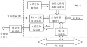 PXI插卡從功能上分為增量式編碼器解碼模塊、RS-232接口模塊、DSP主處理器以及PXI總線接口三部分,該測試卡的結構如圖1所示。